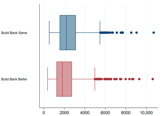 One of the key reasons often given for engaging in BBB is that, by reducing vulnerability, it can reduce future damage. As noted previously, Hallgate et al. [13] estimated annual benefits of USD 173 billion from implementing BBB. Figure 5 and Figure 6 are consistent with such claims of BBB savings. By reducing vulnerability, BBB can have a transformative impact on the frequency with which disasters cause significant damage. Although it is beyond the scope of our analysis, it seems likely that such strategies could reduce not only property damage, but also the number of lives lost. They would also aid in adaptation to climate change.
