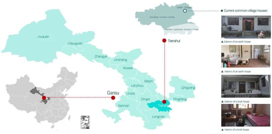 The region of Gansu, situated within China, can be classified as a cold region based on China’s thermal zoning system, while falling within the temperate zone as per the Köppen climate classification. This study selected a developing village in Tianshui, Gansu Province, China (see Figure 1). Datan Village was monitored over a period of winter. The coldest month is January, with an average temperature of −6.0 °C, and the south of Gansu province has substantial precipitation and is considered a wet zone [13]. The traditional house envelope in the Tianshui city of Gansu is mainly of earth construction, therefore, during the winter season, due to the insufficient heating capacity, residences often exhibit a phenomenon of low temperature but high humidity, significantly affecting human comfort. The primary reason of high humidity is the winter snowfall in this region, which leads to moisture absorption by the earth-built structures [14]. Since 2012, some researchers have focused on the strong regional characteristics of the area’s traditional earth constructions, summarizing their construction techniques and structural features [15,16]. Z. N An [17] classified the sink ability class of local clay in the Tianshui city. Other researchers have analyzed survey results, finding that the adobe walls of earth construction offer good abilities to buffer humidity, and favorable thermostability [18]. However, the monitoring of one room did not offer an objective result.