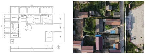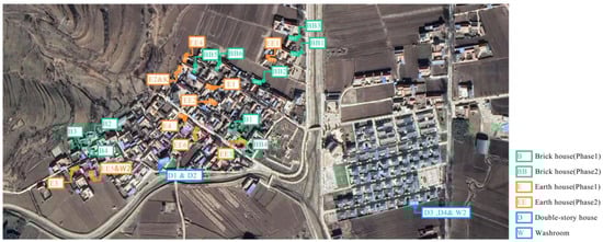 The Datan village is a traditional minority nationality village with 243 villagers. The buildings in the village can be divided by main envelope material: earth or brick. The largest proportion of the villages’ dwellings are constructed with earth, accounting for approximately 60% of the village. Furthermore, the majority of the inhabitants live in this type of housing on a permanent basis. Earth houses are traditional homes built with soil and wood as the outer envelope. The walls of these buildings are made of unsintered soil mixed with sandy clay at a certain proportion [19]. This type of wall preserves heat and features good moisture buffering abilities [20,21]. Most houses in the area are one-story bungalows, with tiles and other decorations on the walls. In addition, there are a large number of brick buildings in the village, some of which are new projects built by villagers self-renovating their own homes (see Figure 1). Others are two-story houses recently built by government builders under the guidance of public policy. The typical layout is depicted in Figure 2, where the courtyards are arranged in a relatively orderly manner, with minimal deviation in the angles of the houses.