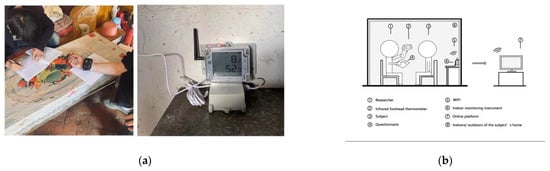 In February 2023, the team sampled 50 individuals in Datan village to conduct a questionnaire survey on thermal comfort, which included an evaluation of the existing environment and the effects of temperature steps on various parts of human body. The outdoor temperatures during this study were all between −1 °C to 10 °C, the average outdoor relative humidity was 55%, the BMI (Body Mass Index) were all between 19–25, and the clothing worn was basically the same (cotton jackets, jumpers and cotton trousers). The specific process was as follows and the operation is shown in Figure 3b: