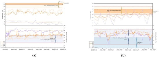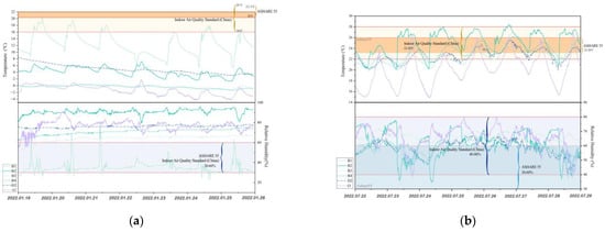 This study employs two different criteria to compare the variations in indoor temperature and humidity of the buildings. Firstly, based on the ASHRAE 55.92 [27], the recommended indoor effective temperature during winter should range between 20–23.5 °C, while during summer it is advised to be within 23–26 °C. The relative humidity should be maintained between 30% and 60%. Secondly, in accordance with the Indoor Air Quality Standard (China), temperature fluctuations should be within 16–24 °C, and relative humidity fluctuations should be between 30–60% in winter. And in summer, temperature should be within 22–28 °C, and relative humidity fluctuations should be between 40–80% [28]. Both contrasting ranges have been indicated in the figure. In this regard, it is noteworthy that the humidity requirements during the winter season in China correspond harmoniously with the recommended guidelines stipulated in the ASHARE 55.92. Consequently, this particular aspect has not been replicated within the depicted visual representation.