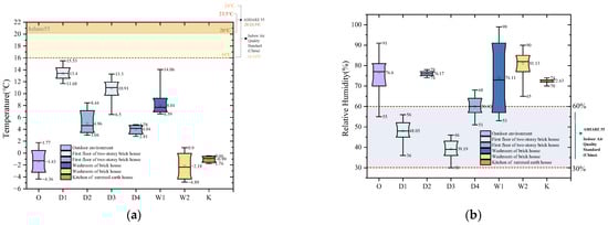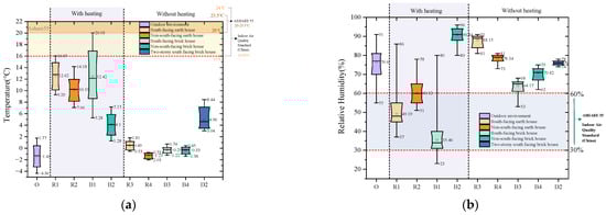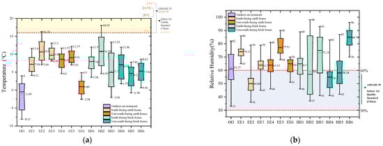 Statistical box of plots of temperature and relative humidity of all measured houses in second monitoring. (a) Temperature of second monitoring in winter. (b) Relative humidity of second monitoring in winter.
