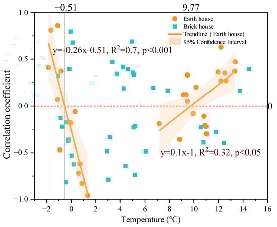 Pearson’s correlation analysis using SPSS 26 of the daily mean temperature squared and daily temperature and relative humidity correlation coefficient values revealed that the data for the earth houses showed a significant correlation (p < 0.005). In contrast, no significant correlation was observed in the data for brick houses (p = 0.981). Through Origin 2021, a polynomial linear fit of the squared daily temperature values to the daily temperature and relative humidity correlation coefficients for the earth houses was achieved. It showed that, as the indoor temperature increased, the temperature and relative humidity correlation coefficients initially decreased and then increased. Two segments of data were then fitted linearly (see Figure 11), demonstrating that between −0.51 °C and 9.77 °C, the correlation showed a negative value, indicating that lower temperatures were associated with higher relative humidity. In low-temperature, high-humidity environments, uncontrolled indoor temperature can worsen the situation. Moreover, when air temperatures was greater than 9.77 °C, a positive correlation between temperature and relative humidity emerged. It was a consequence of the full melting of the crystalline water in the envelope, which can cause moisture releasing effect [33,34].