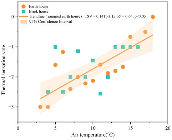 The relative humidity inside the earth houses is more stable and a regression model can be built between TSV and temperature for long-term residents. And the residents in earth houses are more sensitive to changes in temperature. According to the results of the regression simulations, the residents of the earth house felt neutral at temperatures close to 22.5 °C.
