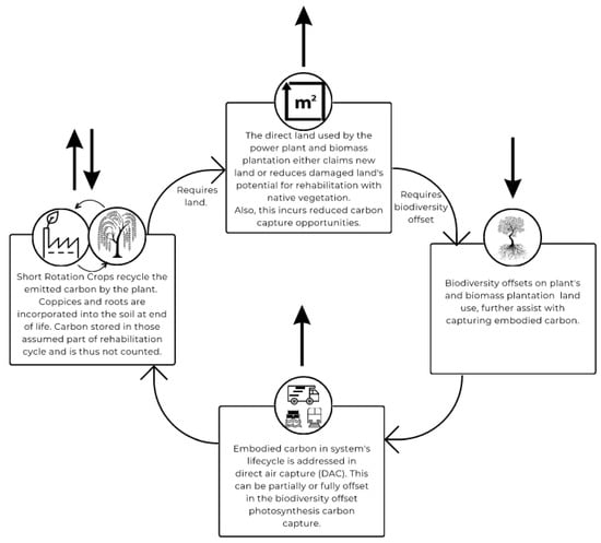 Carbon emissions from electricity generation processes are expected to be captured at the stack. However, for this power plant, the amount of carbon captured by the plantation sites and biodiversity offset site offsets the entirety of the carbon generated via the operation of the plant. As discussed in Section 3.3, to avoid impact trading, the excessive removal of impact in one category cannot justify reduced removal in another category. Thus, when biodiversity offsets are implemented, further capturing of carbon at the stack of the energy plant does not improve EROIg. The LCA takes the captured CO2 by plantation through photosynthesis as the “input” and the carbon released by combustion as the “output” (part 4.1—carbon content) in carbon accounting. Thus, 80% of the net carbon flows do not come from the direct burning of the biomass. This makes bioelectricity a carbon-neutral electricity generation method when accompanied by the 0.25 m2/kWh/y biodiversity offsets (Figure 2). Low levels of biodiversity offsets are needed; this is due to low soil sealing and the use of lands with low significance for the growth of biomass (Table A1—Appendix A).