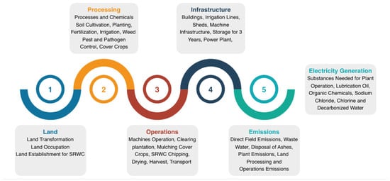 - Power Plant: The power plant is assumed to use a co-generation plant structure. However, this structure is deployed solely for the production of electricity (the produced heat is assumed unused in the LCA). The plant operates on wood chips and has a capacity of 21 MW. The material quantities estimated to be used in plant manufacturing have been linearly scaled up from a 7 MW combined heat and power plant. Although the power plant may last longer than 20 years, the bioenergy plantation and corresponding site would need to be rehabilitated and relocated after 20 years with possible corresponding relocation of the power plant for an optimized cost of energy production. Power plant layout corresponds to a unit installed in 2014 in Switzerland, which is equipped with an electrostatic precipitator for particulate matter (PM) emission reduction and an SNCR (selective non-catalytic reduction) device for a reduction in NOx emissions. Electricity is produced with an organic Rankine cycle (ORC) steam generator with 35% electric efficiency. Wood chips are burned in a boiler at a temperature of 800–1300 °C under excess air conditions and turned into carbon dioxide and water. The wood chip lower heating value used is 18.9 MJ/kg dry mass; this is equivalent to approximately 12 MJ/kg at 30% moisture [28].