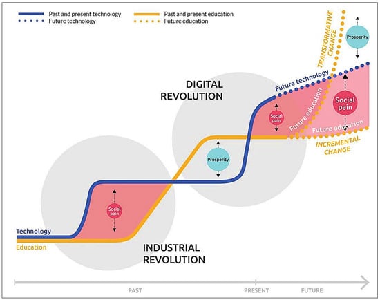Digital Twins (DTs), with the help of components from Industry 4.0 (I4.0) and beyond, have the potential to offer a platform where engineering students can train themselves with a virtual model that represents a real-world physical model from any industry. Students can apply their engineering knowledge to understand the product life cycle (i.e., operational outputs, performance optimisation, predictive maintenance, and product development requirements), thus creating more accessibility to affordable engineering education with minimum cost [5,6,7]. Educational systems must undergo purposive transformation to harness knowledge and skills to minimise the gap between the periods (Figure 1) of social pain and prosperity.