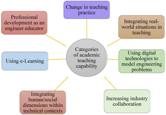 Moreover, the portion of enrolled women undergraduate engineers, hence prospective professionals, was low in Australia at 18% in 2020, although marginally improving from 16% in 2016 [24]. Australian higher education providers are mainly public universities (36 out of 43), private universities, and registered colleges [25]. Australia’s professional engineering education programs comprise 269 Bachelor (honours)-level and 121 Master’s-level engineering courses, focusing on meeting the demand for future workforce resources for various industries [11]. However, the typical engineering curriculum in Australian higher education systems has faced barriers to expanding specialised engineering graduate development to make them fit for the rapidly progressing high-tech interdisciplinary technical industries [11,26]. A few identified barriers comprise the cost of upscaling existing specialised programs designed with hands-on practice-based education and the educators’ capability and institutional ability to provide resources and support. With the progress of industrial revolutions and diversity in engineering applications, it is necessary to develop engineering graduates who offer the skills required by future industries [3,11,27]. The elementary barriers to overcoming and producing the required skilled graduates in Australia are the development of teaching capabilities and affordable learning facilities provided by educational institutes. The ACED identifies seven categories [11,28] of academic teaching capability to deliver future graduate expectations (Figure 3).