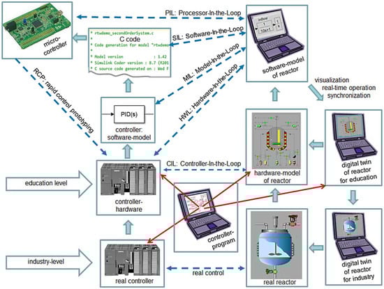 The students in the Master’s program at the Darmstadt University of Applied Sciences in Germany were taught automation and industrial plant process control technologies with DT modelling (Figure 6) [98]. The learning process consisted of converting the mathematical models of the industrial plant processes into hardware models to replicate the real system. First, students manipulated these hardware models (HWM) with real programmable logic controllers (PLCs), a process called controller-in-the-loop (CIL). Then, these HWM and CIL were converted into software models within a host computer, named model-in-the-loop (MIL). Finally, students simulated the reactors with the acquired code from the logic controller, which could be transferred to the microcontroller of the real plant system to run a rapid control prototyping (RCP) test to improve the plant operation processes if needed.