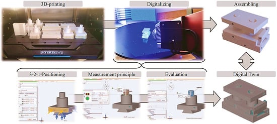 Schleich et al. [106] developed an undergraduate engineering unit to develop critical capabilities in managing the variations of geometrical measurements more efficiently by applying DT technology with the Department of Mechanical Engineering in the Friedrich–Alexander–Universität Erlangen–Nürnberg (FAU), Germany. The example model was developed by incorporating DT in this course to introduce vital learning content for product lifecycle management, additive manufacturing, and product-assembly applications in modern industries (Figure 7). Though COVID-19 restrictions to conduct physical model assembly validation by the students hampered the teaching activities, a doctoral student validated a similar task, indicating a positive initiation of the DT system in managing geometrical variations.