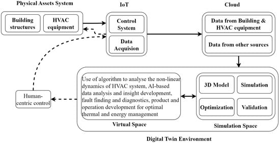 Converting the HVAC system into a DT prototype model offers more significant benefits. Creating a DT model enables consideration of the dynamic non-linear characteristics of HVAC systems [110,111,112]. Furthermore, opportunities exist to incorporate additional analyses on fault detection and diagnosis of the HVAC control systems [111] to achieve the dynamic asset management objectives through efficient thermal, air quality, and energy management [112,113].