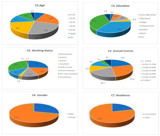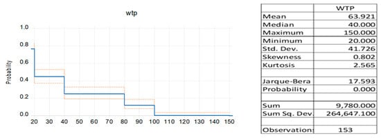 The sample of the study consisted of 169 answered questionnaires, randomly collected as the spectators left the festival. There were 153 valid questionnaires and the main sample characteristics are presented in Figure 1 below. An interesting characteristic of the sample is that 78% of the visitors are tourists, i.e., they are not residents of Kalamata, and 61% of them noted the dance festival as their main reason for visiting. Unfortunately, the participation of the residents of Kalamata in the festival is particularly low. Women make up 71.24% of the total sample, a particularly large percentage, which is confirmed by many studies. Women attend more cultural events, and this trend is increasing in the dance industry. The sample surveyed is characterized by a high educational level, with 75.8% of those sampled being graduates of higher education, and 40% of them holding a master’s or a doctoral degree. Regarding the income of the visitors, there is a dispersion among the seven income categories, which, however, were at low to moderate levels, since 62.7% are concentrated in the first three categories (up to EUR 24,999). The age stratification of the sample holds no surprises. Sixty-five percent of the audience is between 20 and 49 years of age, almost evenly distributed among the three age categories (20–29, 30–39, 40–49). The demographic factors that were found to influence the WTP are in accordance with previous studies [62].