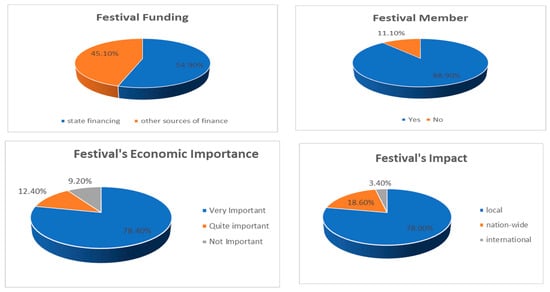 Reviewing the spectators’ perceptions of the importance of cultural heritage to the local economy, it was found that 75% of the sample surveyed considered festivals very important for local development, and 20% quite important, which complies with previous findings in the literature [64]. As far as the Kalamata Dance Festival is concerned, Figure 2 below demonstrates that: