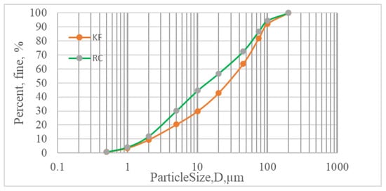 OPC clinker (CL) and industrial-grade gypsum powder (Gy) were used as reference materials to prepare the ternary blends. The kunkur fines (KFs) were obtained from the East African Portland Cement Company (EAPCC). The raw clay (RC) was sourced in Nandi County (1.3973°, 34.4489°), Kenya. The particle size distribution (PSD) of KFs and RC (Figure 1) was measured by laser scattering using a Bettersizer SD particle size analyzer (LS13-320; Bettersize Instruments Ltd., Dandong, China). A muffle furnace was used to calcine the raw clay at 800 °C for 2 h. Standard sand (CEN Standard Sand EN 196-1:2016) [] was used to cast the mortars.