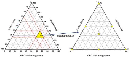 The experimental design used consists of the probed subset in the mixture space (Figure 3), where each variable is fixed at the lower and upper levels of the mixture space explored. The experimental mixture space covered a range from 40 to 55%, 15 to 30%, and 25 to 40% for CL, KF, and CC, respectively, whereas the amount of gypsum was kept constant at 5%. For reference, Portland cement with composition meeting CEM I type was prepared following the standard specified in []. The experiments were performed according to the mixture composition for the experimental points in Figure 3 and their responses (the compressive strengths for the respective curing days) reported, based on a linear mathematical equation (Equation (1)). The equation describes the influence of the main factors (KF, CC, and CL) and their interactions with respect to the response parameter Y (compressive strength):