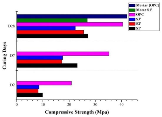 The compressive strength of the blends reported in Table 2, as well as that of the 28 days mortar samples, is displayed in Figure 5.
