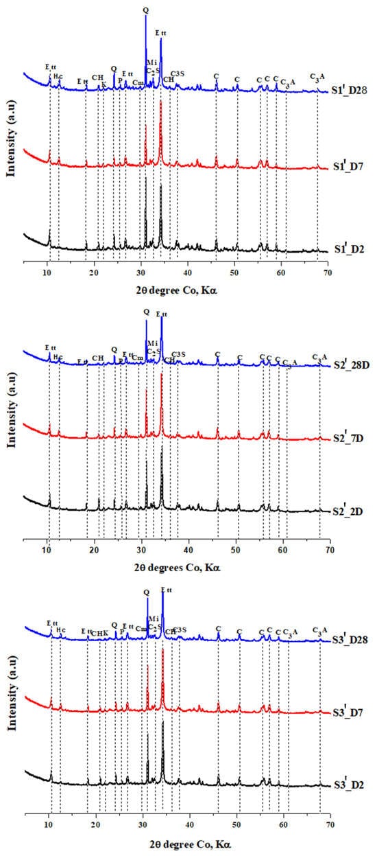 XRD patterns for the cement samples S1′, S2′, and S3′ at 2, 7, and 28 days of curing. C, CH, C3S, C2S, C3A, Ett, Hc, K, Mi, P, and Q denote calcite, portlandite, alite, belite, aluminate, ettringite, hemicarboaluminate, kaolinite, microcline, and quartz, respectively.