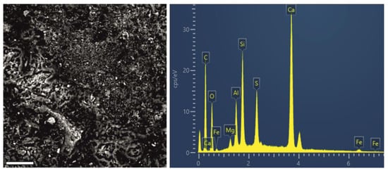 An example of the details of the matrix is displayed in Figure 9 for sample S1′. The matrix is composed of finely dispersed reaction products and small capillary pores. The EDS spectrum acquired in this location displays the presence of Ca, Si, Al, and S as major elements, compatible with the precipitation of C-(A)-S-H, portlandite, ettringite, and hemicarboaluminate.