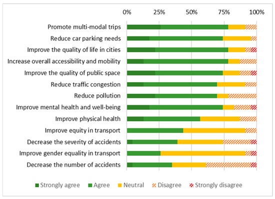 Regarding the role of shared e-scooters in the ideal vison of cities and urban mobility (Figure 3), around three-quarters of the experts agree or strongly agree that they can contribute to promoting multi-modal trips, to improving the quality of life in cities, to increasing overall mobility and accessibility, to improving the quality of public space and to improving mental health and well-being. Moreover, between 67% and 75% of the experts also agree or strongly agree that shared e-scooters can help to reduce negative externalities of transport systems such as car parking needs, pollution and traffic congestion.