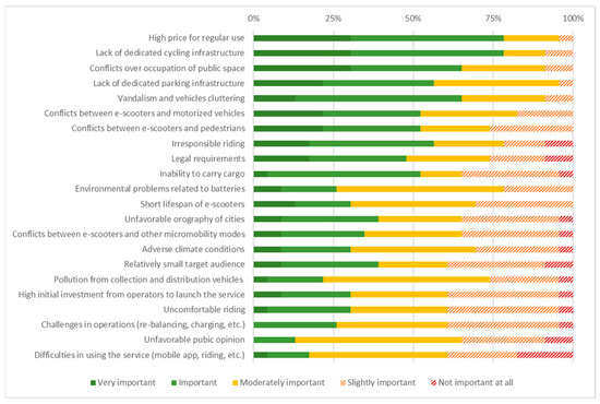 On the other hand, the following factors were classified as “1. not important at all” or as “2. slightly important” by 40% of the experts: need for high initial investment from service providers, uncomfortable riding of e-scooters, challenges in operation, possible user difficulty in utilizing the system (e.g., mobile application and/or riding) and unfavorable public opinion.