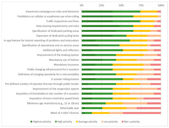 Most importantly, our study provides relevant insights for decision-makers (and others) by outlining a prioritized set of 22 measures related to shared e-scooters, aiming to transition from the current context to an idealized vision of cities and mobility. Most of the actions vastly classified as top priorities are either associated with e-scooter usage, education and enforcement—including awareness campaigns on traffic rules and riding behavior, prohibition of mobile phone or earphone use while traveling, inspection and fines for non-compliance—or with the development or adaptation of transport infrastructure, namely the expansion of the network of cycling lanes and the specification of dedicated areas for e-scooter parking. Operators sharing data on the use of the system with public entities was also largely considered a top priority. In general, measures related to the improvement of vehicles were not deemed as relevant.