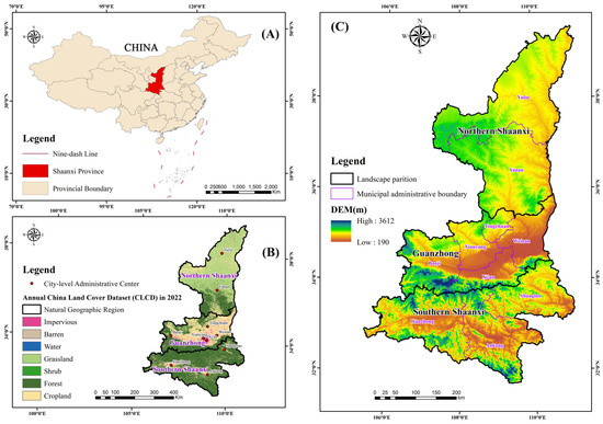 Shaanxi Province is located in central China in the center of the Yellow River. It borders the higher levels of the Jialing River in the Qinba Mountain region as well as the southern portion of the Han River Basin, which is a Yangtze River tributary. Sichuan Province and Chongqing Municipality to the south, Hubei Province and Henan Province to the southeast, Ningxia Hui Autonomous Region and Gansu Province to the west, Shanxi Province to the east across the Yellow River, and Inner Mongolia Autonomous Region to the north are its borders. There are 206,000 square kilometers in all. The province is mostly made up of several types of topography, with a tendency toward higher elevations in the north and south and lower elevations in the center. These terrains include plains, mountains, plateaus, and basins. The climate of Shaanxi Province’s north and south varies significantly, as do the kinds and amounts of flora in each region. Northern Shaanxi, Guanzhong, and southern Shaanxi are the province’s three naturally occurring geographical areas, separated by variations in terrain, landforms, and flora types. Shaanxi spans three climatic zones, with the northern part of northern Shaanxi and along the Great Wall belonging to the temperate zone, southern Shaanxi belonging to the northern subtropical zone, and Guanzhong and most of northern Shaanxi belonging to the warm temperate zone. The province’s yearly mean temperature ranges from 0 to 16 °C, progressively dropping from east to west and from south to north. The province experiences between 340 and 1240 mm of precipitation on average every year, with the south receiving more precipitation than the north. The regions of Guanzhong, northern Shaanxi, and southern Shaanxi are semi-arid, semi-humid, and humid, respectively. There are large disparities in the distribution of the province’s complex and varied flora types. The region north of the Great Wall in Shaanxi’s northern region is near the desert, where desert plants predominate and there is little vegetation. The southern part of Yulin and the northern part of Yan’an, south of the Great Wall, are typical loess plateau regions where soil erosion is severe and vegetation coverage is low, mainly consisting of shrubs. The Beishan Mountains are distributed with deciduous broad-leaved forests, with higher vegetation coverage. The Guanzhong region is characterized by a large number of agricultural fields, and urban development has led to lower vegetation coverage. The Qinling Mountains and the northern part of southern Shaanxi are dominated by warm temperate deciduous broad-leaved forests, while the Bashan region has evergreen broad-leaved forests and deciduous broad-leaved forests, with good vegetation coverage. Figure 1 depicts the study area’s location, land-use types, and elevation distribution, where Figure 1A indicates the location, Figure 1B illustrates the distribution of land-use types in the study area in 2022, and Figure 1C depicts the distribution of surface elevation in the study area.