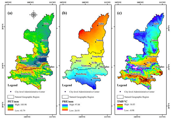 Mean distribution maps of three meteorological factors in the study area from 2013 to 2022. Specifically, panels (a–c) illustrate the mean values of potential evapotranspiration (PET), precipitation (PRE), and temperature (TMP), respectively.