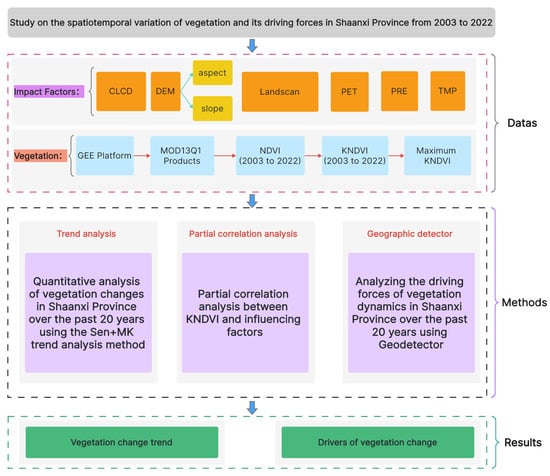 Theil-Sen Median and Mann-Kendall trend analysis techniques have been used in the quantitative study of vegetation change trends in Shaanxi Province over the previous 20 years using temporal KNDVI data. This study used elevation, slope, and aspect as environmental parameters and land-use type and population density as anthropogenic elements in accordance with previous research [41,42,43,44,45]. The meteorological parameters that were selected included the yearly average temperature, the annual average precipitation, and the annual average potential evapotranspiration. The association between the KNDVI data and each component was examined and evaluated using the partial correlation analysis approach. The reactions and underlying causes of interannual vegetation changes to each condition were also examined using the geo-detector. The study’s flowchart is displayed in Figure 3.