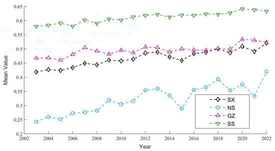 The research area’s yearly average KNDVI values from 2003 to 2022. Shaanxi Province is represented by SX, whereas the areas of Guanzhong, northern Shaanxi, and southern Shaanxi are represented by GZ, NS, and SS, respectively.
