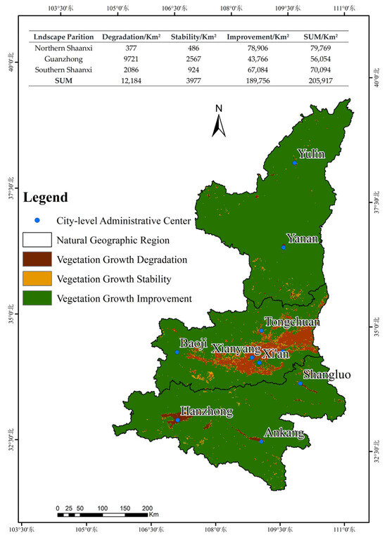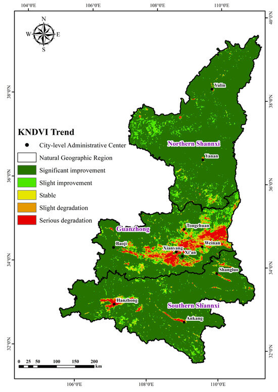 The temporal KNDVI data slopes were estimated using the Theil–Sen median method, as shown in Figure 5. The analysis reveals an overall improvement in vegetation cover in Shaanxi Province, with localized areas exhibiting a declining trend. Urban regions such as Xi’an, Baoji et al. in the Guanzhong urban cluster, significant cities in southern Shaanxi such as Hanzhong and Ankang, and urban areas in northern Shaanxi such as Yulin and Yan’an are the main locations of vegetation degradation. The area with improved vegetation growth covers 189,756 km2, accounting for 92.15% of the total area; the area with stable vegetation growth covers 3977 km2, accounting for 1.93% of the total area; and the area with deteriorating vegetation growth covers 12,184 km2, accounting for 5.92% of the total area. In terms of geographic regions, the area with improved vegetation growth has the highest proportion in the northern Shaanxi region, accounting for 98.92% of the northern Shaanxi area, followed by the southern Shaanxi region, accounting for 95.71% of the southern Shaanxi area, and finally the Guanzhong region, accounting for 78.08% of the Guanzhong area. The area with stable vegetation growth has the highest proportion in the Guanzhong region, accounting for 4.58% of the Guanzhong area, followed by the southern Shaanxi region, accounting for 1.32% of the southern Shaanxi area, and finally the northern Shaanxi region, accounting for 0.61% of the northern Shaanxi area. In the Guanzhong region, the area with declining vegetation growth makes up the largest proportion (17.34%), followed by the southern Shaanxi region (2.98%) and the northern Shaanxi region (0.47%) of the Guanzhong region.