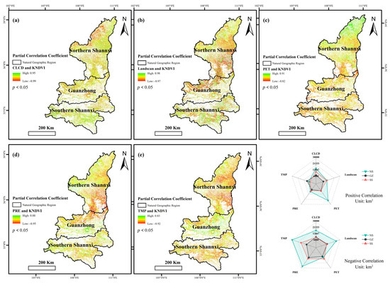 Partial correlation analysis of influencing factors and KNDVI, where NS, GZ, and SS represent northern Shaanxi, Guanzhong, and southern Shaanxi, respectively. (a–e) respectively represent CLCD, Landscan, PET, PRE, and TMP.