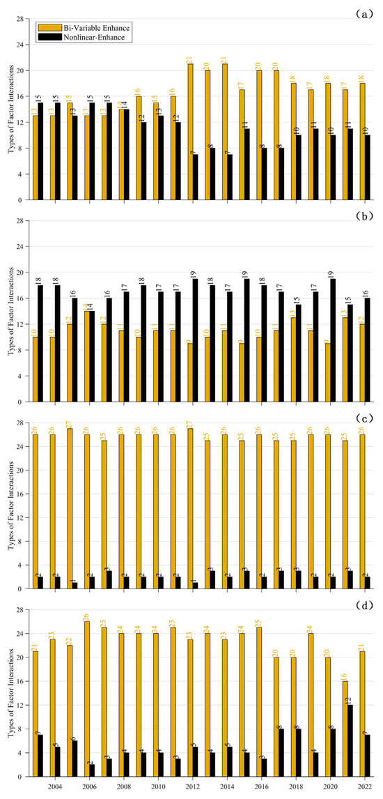 Figure 8 computes and displays the annual count of interactions between different variables from 2003 to 2022. Bivariate enhancement and nonlinear enhancement are two examples of the interactions between influencing elements that are depicted in the graph. In graph (a), the interaction effects among influencing factors leading to changes in vegetation KNDVI in Shaanxi Province were relatively balanced between the two types from 2003 to 2011. However, from 2012 to 2022, the number of bivariate enhancement interaction types exceeds that of nonlinear enhancement. From graph (b), it can be seen that, in the northern Shaanxi region, the number of nonlinear enhancement interaction types between influencing factors is greater than that of bivariate enhancement. From graph (c), it can be seen that, in the Guanzhong region, the bivariate enhancement is the dominant type of interaction between influencing factors. From graph (d), it can be seen that, for the southern Shaanxi region, the interaction types between influencing factors are similar to those in the Guanzhong region, with bivariate enhancement being the main type.