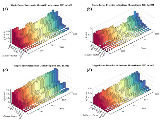 (a–d) Results of single-factor detection. Graphs (a), (b), (c), and (d) respectively represent the single-factor detection results of Shaanxi Province, Northern Shaanxi, Guanzhong, and Southern Shaanxi.