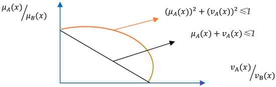 Figure 1 compares the intuitionistic and Pythagorean fuzzy spaces. The space bounded by the curved line refers to Pythagorean fuzzy space, while the space bounded by the straight line represents intuitionistic fuzzy space, which is clearly smaller.
