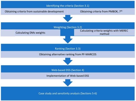 8]. The significant contribution of this study lies in the fact that a new integrative approach was employed to develop a web-based decision support system for evaluating projects by considering Pythagorean fuzzy uncertainty and two new decision-making approaches, i.e., MARCOS and MEREC, while focusing on the principles of PMBOK (7th edition), organization strategies, and sustainable development.