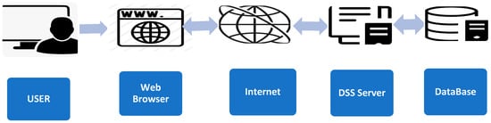 Figure 5 shows the proposed web-based DSS. Users should search for the DSS address in the web environment of a computer or device connected to the internet, and their requested information will be sent to the DSS server. The server provides a web-based user interface written in C# using the Microsoft ASP.NET framework. This allows people to easily access the server from remote locations. The data related to DSS in this research are based on a database using SQL Server 2019, which was installed on the same DSS server. The requested information was called from the database and provided to the end user. The database type was relational. This relationship between the main tables is shown in