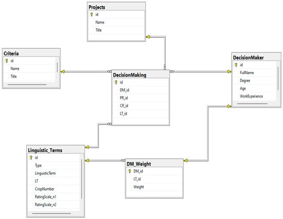Figure 6. In a relational database, relationships are created between tables to avoid repeating multiple records or fields. The main tables of the relational database used herein were Projects, Criteria, DecisionMaking, DecisionMakers, Linguistic_Terms, and DM_Weight. Each table contained information fields, as shown in the figure below.