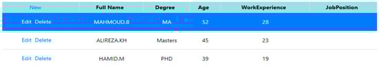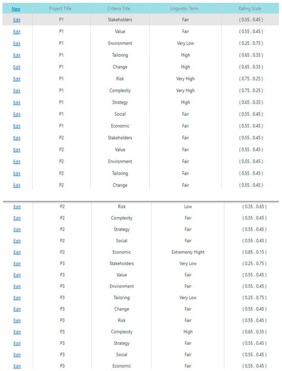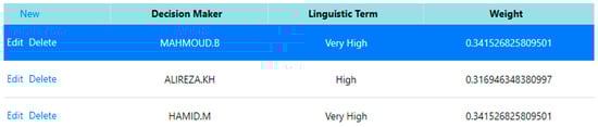 Figure 10. Basic information, such as project information, was entered in the project section. The decision-makers’ information was entered in the decision-makers section. The information on language variables was entered in two parts. Linguistic variables related to decision-makers were stored in the decision matrix linguistic terms section, and information related to the linguistic variables of decision-makers’ weights was stored in the decision-makers’ linguistic terms section. Branch information was entered in the criteria section. Decision-makers were weighted in the decision-makers’ weights section.