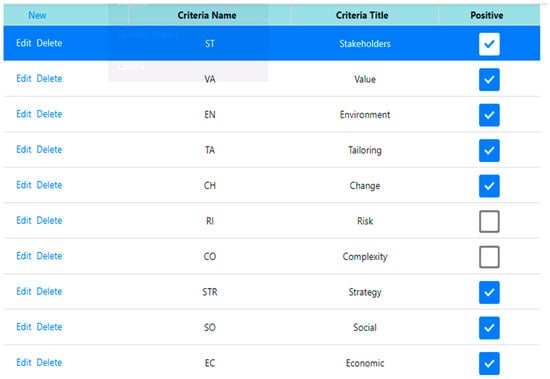 Figure 11 shows the data entry environment for criteria. As is apparent in the figure, risk and complexity criteria were regarded as negative criteria, and the remaining criteria were positive. The ability to add criteria and determine whether they were positive or negative is considered in this table.