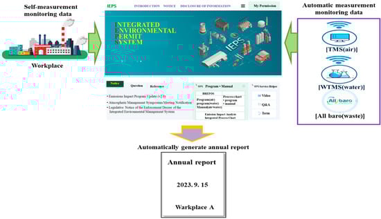 Workplaces also maintain records, as shown in Figure 3, and submit annual reports through the IEPS. These reports are based on monthly self-monitoring records (as described in Section 3.2.1), data from the water quality remote monitoring system, and data automatically measured and transmitted from automatic measuring instruments for chimneys.