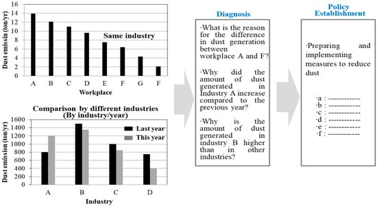 By analyzing the big data of workplaces collected in the IEPS, it is possible to effectively establish a diagnosis and dust reduction measures for each workplace by identifying why annual dust emissions vary by workplace in the same industry and why the workplace that emits the most dust and the workplace that emits the least dust differ as much as they do; panel (a) of Figure 4 provides more details.