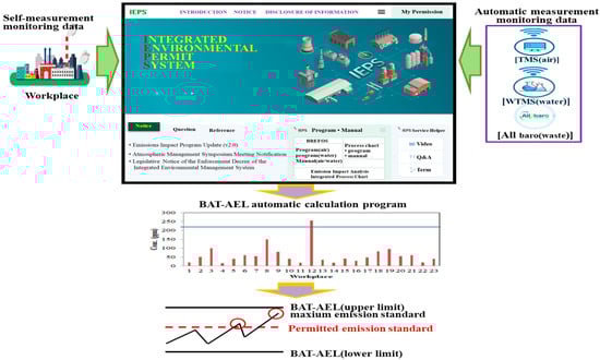 All values from the TMS, WTMS, SEMS, and self-measured data used to establish emission levels linked to optimal available techniques must be recorded and preserved according to the Record Preservation Notice [24] and are entered into the IEPS. Therefore, as depicted in Figure 5, the pollutant monitoring data recorded and preserved in the IEPS can be used to set emission levels linked to the optimal available techniques.