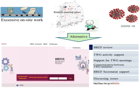In light of these inefficiencies and potential health-related issues arising from TWG operations, it is worth considering the implementation of an information system as an alternative solution. As shown in Figure 6, the BAT Reference Operation System (BREFOS) was developed in South Korea and used to support the operation of TWGs (organizing meetings, facilitating information exchange, and gathering opinions on draft BREFs) and the preparation of BREFs [25].