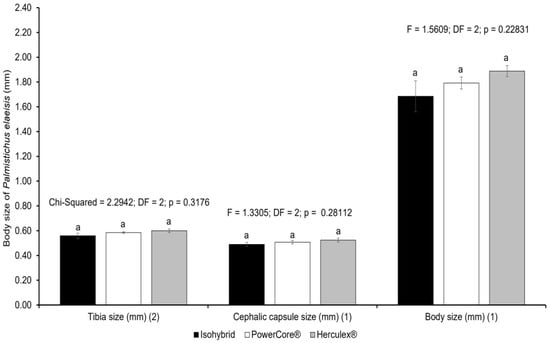 Size of the tibia, cephalic capsule, and body (mean ± standard error) of Palmistichus elaeisis (Hymenoptera: Eulophidae) in pupae of Spodoptera frugiperda (Lepidoptera: Noctuidae) fed with three maize genotypes: isohybrid, Herculex®, or PowerCore®. Similar letters arranged on the bars do not differ statistically from each other based on the respective sample comparison test. (1) Parametric test: F test at 5% significance. (2) Non-parametric test: Kruskal–Wallis test at 5% significance.
