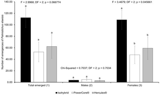 Total number of emerged males and females (mean ± standard error) of Palmistichus elaeisis (Hymenoptera: Eulophidae) in pupae of Spodoptera frugiperda (Lepidoptera: Noctuidae) fed with three maize genotypes: isohybrid, Herculex®, or PowerCore®. Similar letters arranged on the bars do not differ statistically from each other based on the respective sample comparison test. (1) Parametric test: F test at 5% significance. (2) Non-parametric test: Kruskal–Wallis test at 5% significance. (3) Parametric test: Scott-Knott test at 5% significance.