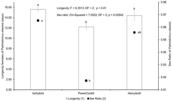Six newly emerged females of P. elaeisis (F1) from each treatment were placed in glass tubes (14 × 2.2 cm) covered with a cotton ball and containing a drop of honey for longevity assessment (days). Other parasitoids were assessed for the number of emerged individuals, males, females, and sex ratio.