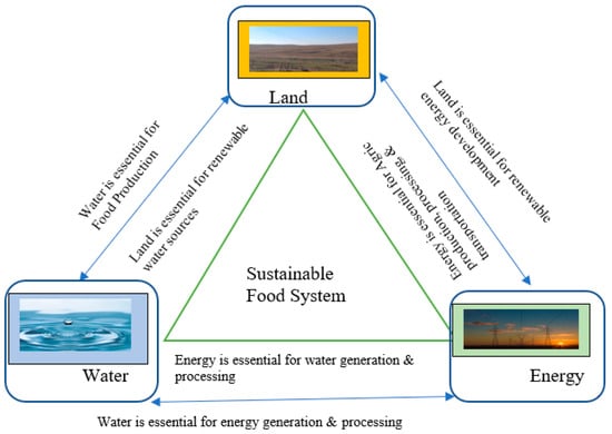 Various approaches have been employed to foster the sustainable management of food systems, including the land–water–energy nexus. The LWE nexus constitutes an approach that is applied to promote the efficient use and management of resources. The interrelatedness of the land, water, and energy resources (Figure 1) depicts their relevance in enhancing each of the resources’ use and management as well as their contribution to food security and sustainable food systems. For instance, land offers multiple ecosystem services to support human livelihoods, such as food, freshwater, biodiversity, and climate change impact mitigation []. In addition, land is a key resource for the establishment of renewable sources of energy, including solar and wind energy [,]. Meanwhile, water is utilised in the agricultural value chain from production to manufacturing and distribution, as well as in the generation and transportation of different forms of energy []. Energy also plays a vital role in the production, transportation, manufacturing, preservation, and distribution of food as well as in the extraction, pumping, treatment, distribution, and collection of water [].