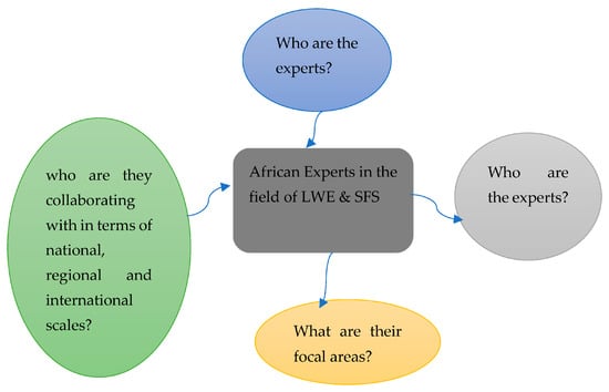 Following the selection of published records in the research area was the identification of the experts in the field of land, water, energy nexus and food systems research in Africa. The experts were selected based on their contributions to the African-focused LWE or WEF publications. This was essential to show who the African authors were collaborating with internationally in their research. The identification of the experts was informed by the following key questions, as shown in Figure 3.