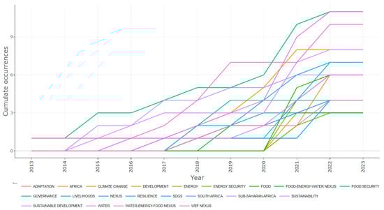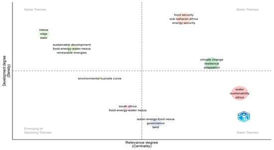 To better appreciate the significance of the themes, a thematic map was very useful. The thematic map constituted two axes, including the x-axis development degree (density) and the y-axis relevance degree (centrality) (Figure 10). The thematic map was structured into four quadrants: niche themes, motor themes, emerging or declining themes, and basic themes. The niche themes, such as sustainable development, SDGs, food–energy–water nexus, and renewable energies, represented highly specialised and well-established topics within the field. The motor themes, which encompassed food security, energy security, climate change resilience, and adaptation, were pertinent research areas that have witnessed substantial growth. The emerging and declining themes encompassed newly introduced research areas and those that are gradually fading into obscurity. Finally, the basic themes, including water–energy–food nexus governance and water sustainability, are fundamental subjects that are relevant to research but still require further development.