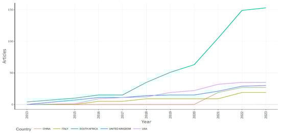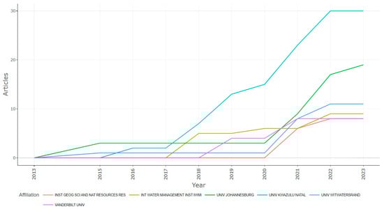 However, the results shown in Figure 8 showed the growth in affiliation engagement in LWE and SFSs. Most of the high-ranking affiliations undertaking this research were based in South Africa. Generally, the rated affiliations both in Africa and internationally included the University of KwaZulu Natal, University of Johannesburg, University of Witwatersrand, International Water Management Institute (IWMI), Vanderbilt University, and Institute of Geoscience and Natural Resources, which are listed in order of merits. However, African scholar participation in this thematic area in terms of the author’s country of residence was narrow when compared to a global scale. It was of great concern to see that, except for South Africa, the country production over time on African-based research was dominated by foreign nations, including the USA, China, United Kingdom, and Italy (Figure 9). This outcome goes to show that the discourse on knowledge decolonisation has not gained acceleration in this research area.